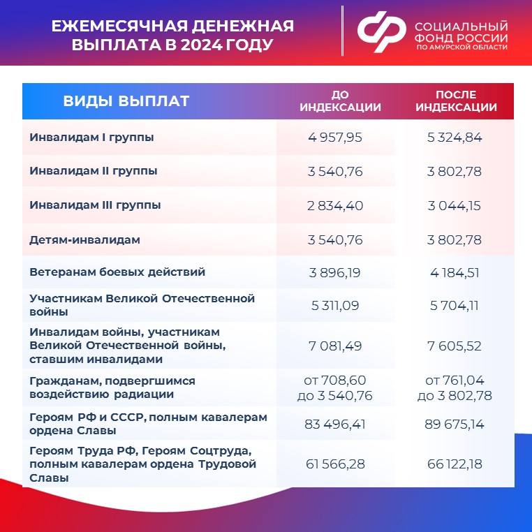 Точные размеры выплат в Приамурье, проиндексированных с 1 февраля 2024 года, в наших карточках.