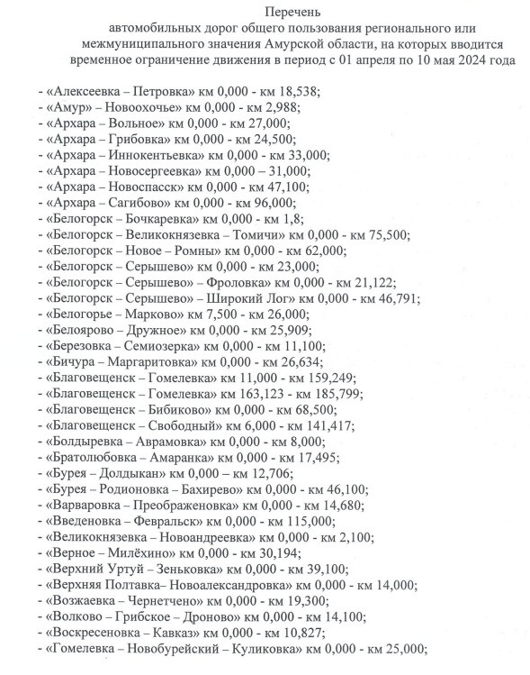 Перечень дорог, на которых вводится временное ограничение движения с 15 апреля по 24 мая: