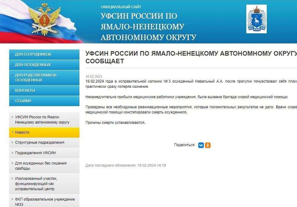 Фото: РИА Новости УФСИН ЯНАО сообщает о том, что Алексей Навальный скончался в колонии.