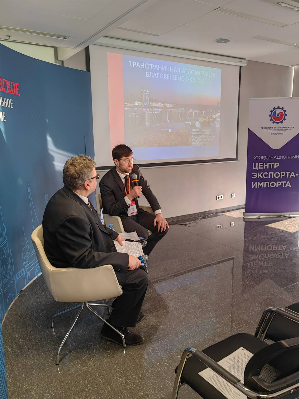 Советник мэра Благовещенска, председатель Международного центра делового сотрудничества Максим Ноженкин выступил с презентацией уникальной трансграничной агломерации Благовещенск-Хэйхэ.