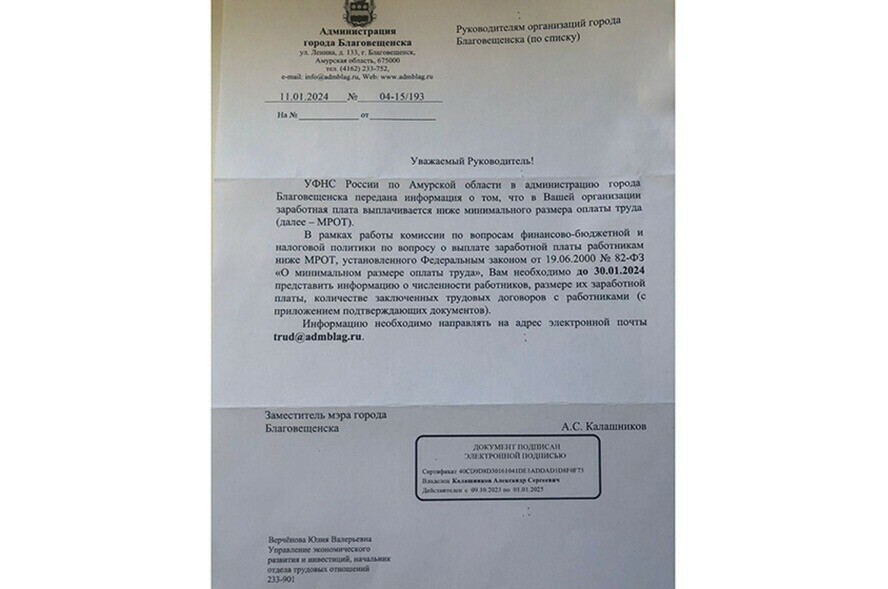 Фото: ТГ "Амурский бизнес" В мэрии Благовещенска ответили на запрос Amur.life по поводу писем, которые получают некоторые городские бизнесмены.