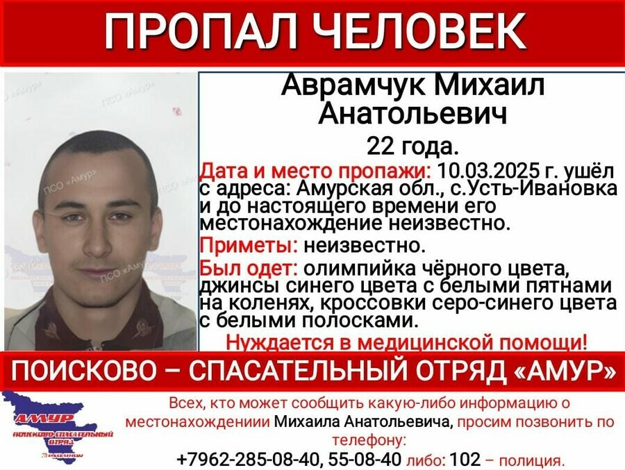 Волонтеры поисково-спасательного отряда «Амур» начали поиск 22-летнего Михаила Аврамчука.