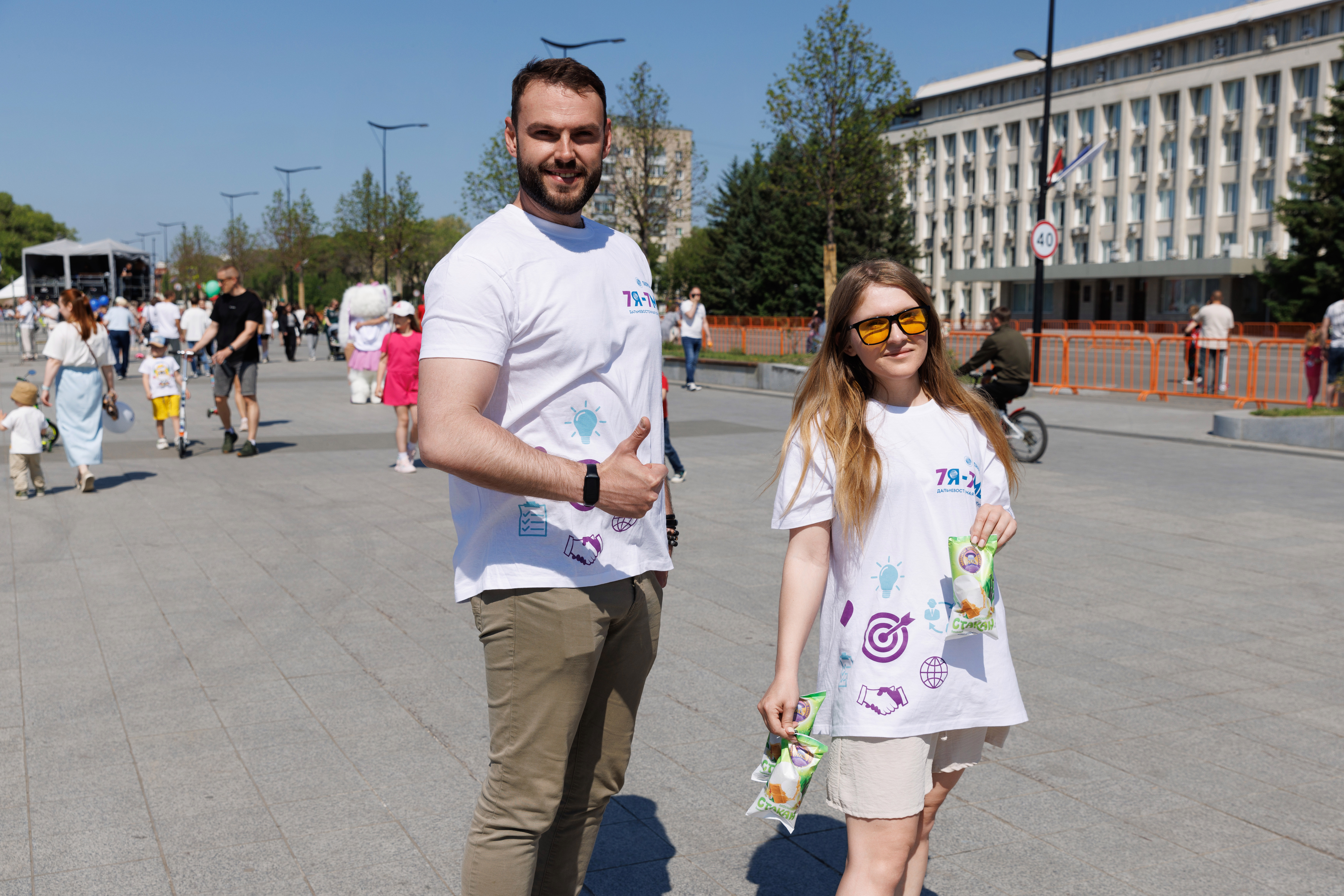 Кроме того, во время праздничных гуляний на городской площади, юных благовещенцев бесплатно угощали мороженым. Акцию организовал «Газпромбанк». Также, для ребят организовали площадку с аквагримом.