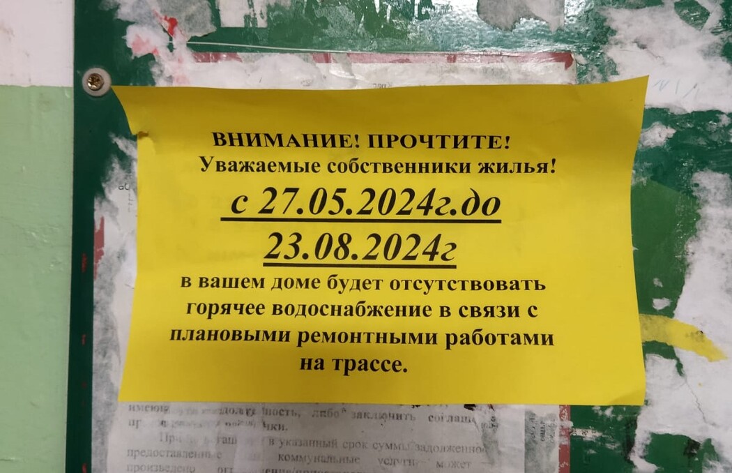 «Уважаемые собственники жилья, с 27 мая по 23 августа в вашем доме будет отсутствовать горячее водоснабжение в связи с плановыми ремонтными работами на трассе», – написано на листочке, размещенном на доске объявлений.