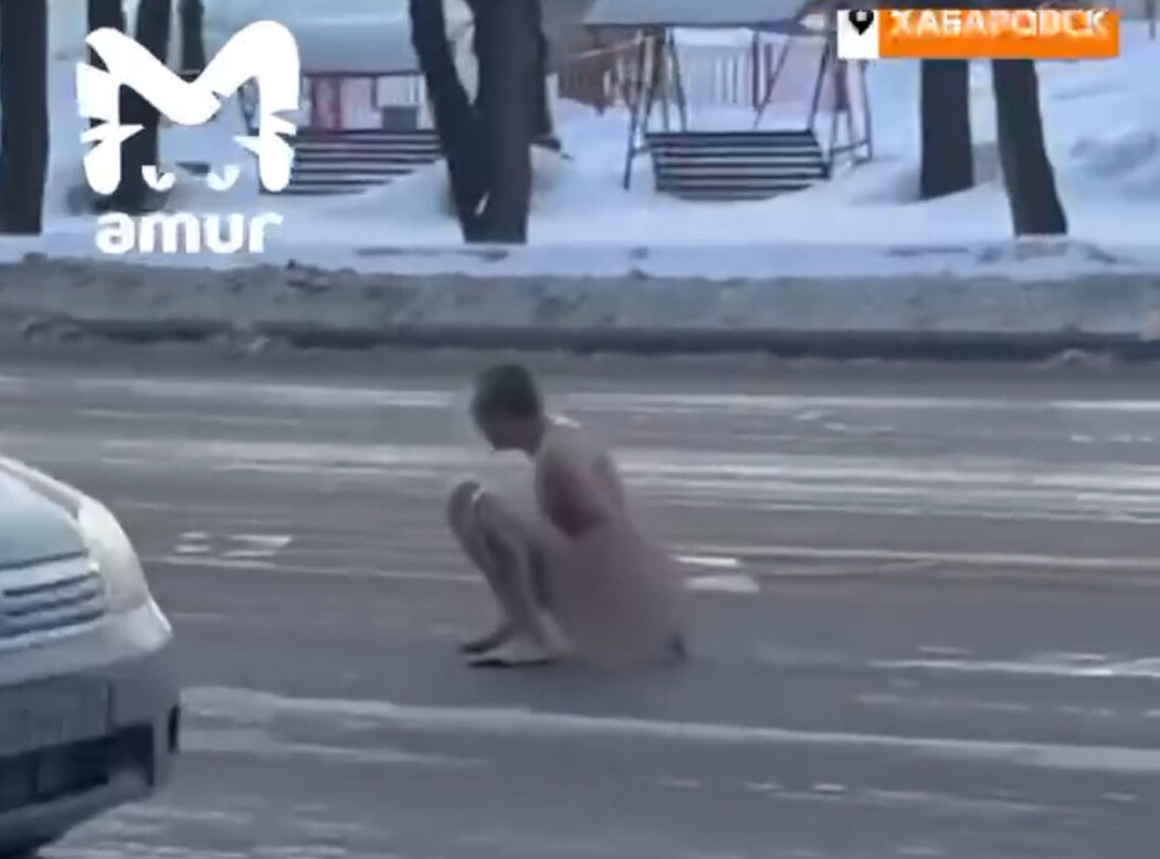Не боясь большого количества машин, не стесняясь людей, он разгуливал по проезжей части, периодически ползая на коленях. Очевидцы предположили, что у парня весеннее обострение или он под действиями наркотических препаратов, поэтому и разгуливает в таком виде в сильный мороз.